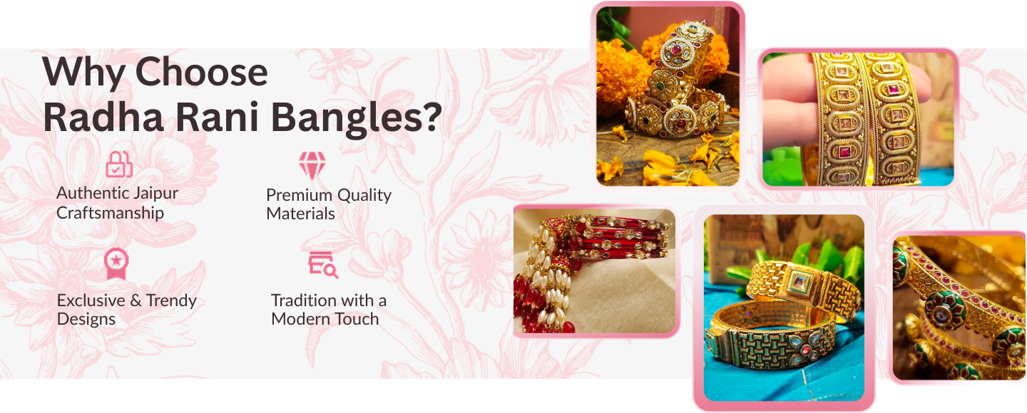 Shop handcrafted bangles from Jaipur — pure lac bangles, glass bangles for women, brass bangle sets and bridal chura. Every piece is crafted with 888-grade stone quality, GST exempt, made by Indian women artisans. Style your wrists with elegance for every look and occasion.