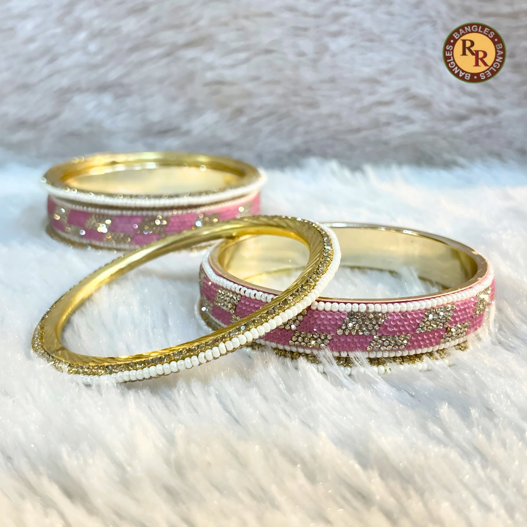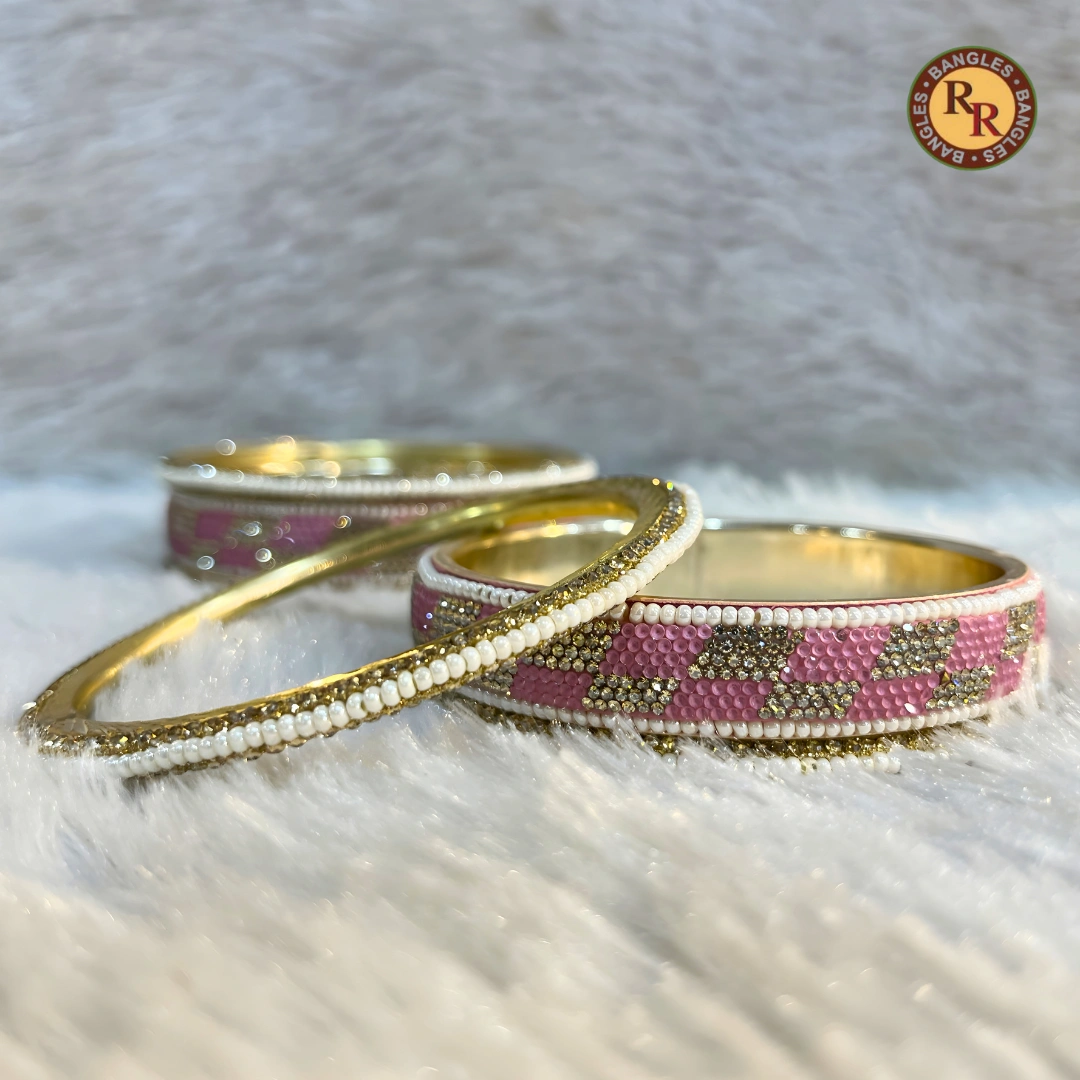 Premium brass bangle set, pink meenakari with white pearl border, gold diamond geometric work & crystal slim bangle. Bridal bulk wholesale for retailers.