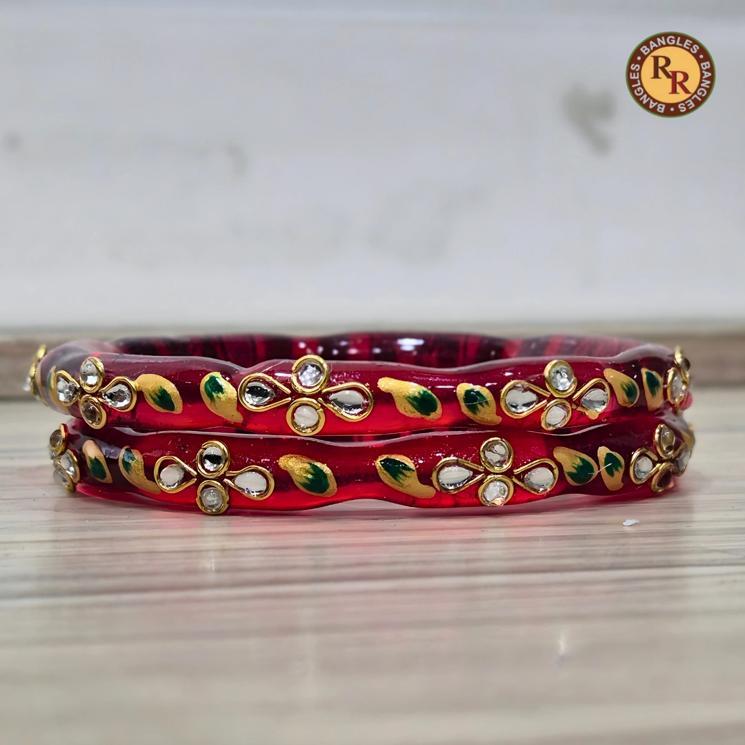 These stunning deep red glass crystal bangles are elegantly hand-embellished with sparkling kundan stones and rich green meenakari leaf detailing. A timeless bridal and festive choice for traditional ethnic wear. Available in bulk and wholesale quantities.